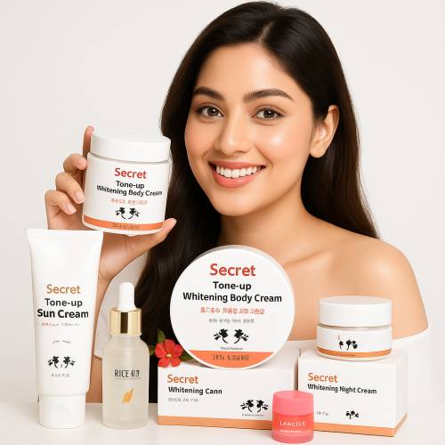 1. Secret Tone-up Sun Cream – SPF 50+ দিয়ে সূর্য রশ্মি থেকে সুরক্ষা ☀️ 2. Secret Body Cream – মসৃণ ও উজ্জ্বল ত্বক 🌿 3. Secret Night Cream – রাতে স্কিন রিপেয়ার করে গ্লোয়িং ফিনিশ 🌙 4. Rice Essence serum– স্কিন টোন উন্নত করে ও দাগ হালকা করে 5. Laneige Lip Sleeping Mask – ঠোঁটকে রাখে গোলাপি ও সফট 💋